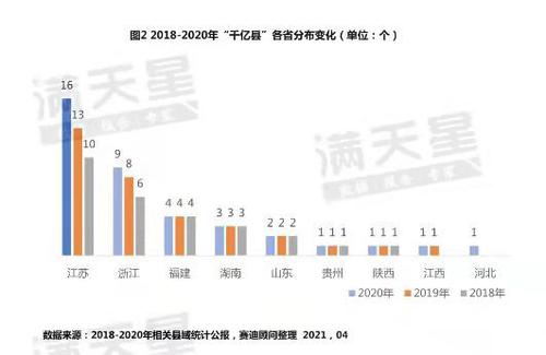 数据显示,2018年至2021年,江苏“千亿县”从10个上升至17个,浙江则从6个上升至9个。以2020年为例,仅浙江一省“千亿县”体量就等于福建(4个)、湖南(3个)和山东(2个)的总和。