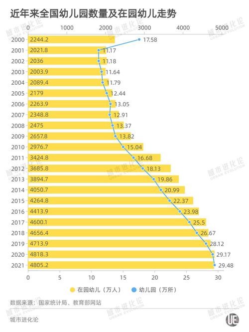 其中,全国共有幼儿园29.48万所,在园幼儿4805.21万人。学前教育毛入学率88.1%。值得注意的是,2021年在园幼儿相比上年减少13.1万人,是将近20年来首次下降。