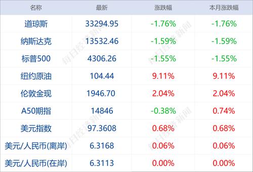 美股方面, 美股三大指数集体收跌,道指跌597.65点,跌幅1.76%,纳指跌超200点,跌幅1.59%,标普500指数跌1.55%。新能源汽车股下挫,Lucid跌超13%,Rivian跌超8%,小鹏汽车近7%。银行股走低,德意志银行跌超8%,巴克莱银行、富国银行跌超5%。贵金属板块、油气股逆市上涨,哈莫尼黄金涨超13%,赫克拉矿业涨超12%,雪佛龙涨近4%。