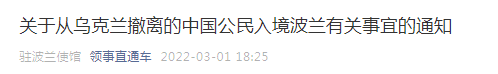 3月1日晚间,中国驻波兰使馆发布了关于从乌克兰撤离的中国公民入境波兰有关事宜的通知: