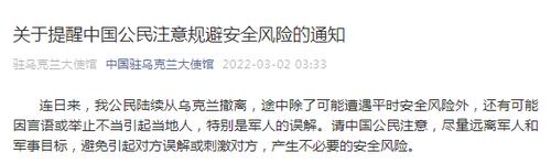 3月2日凌晨,据中国驻乌克兰大使馆发布关于提醒中国公民注意规避安全风险的通知。