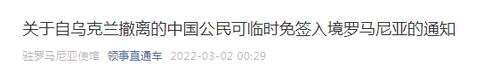 3月2日凌晨,中国驻罗马尼亚使馆发布了关于自乌克兰撤离的中国公民可临时免签入境罗马尼亚的通知: