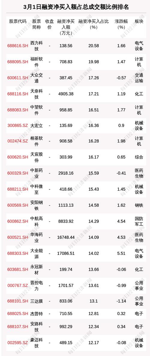3月1日两市共有1136只个股有融资资金净买入。共有34只股票融资净买入额占总成交金额比例超10%,其中西力科技、福昕软件、大众交通排名前三,占比分别为20.58%、19.98%、17.26%。