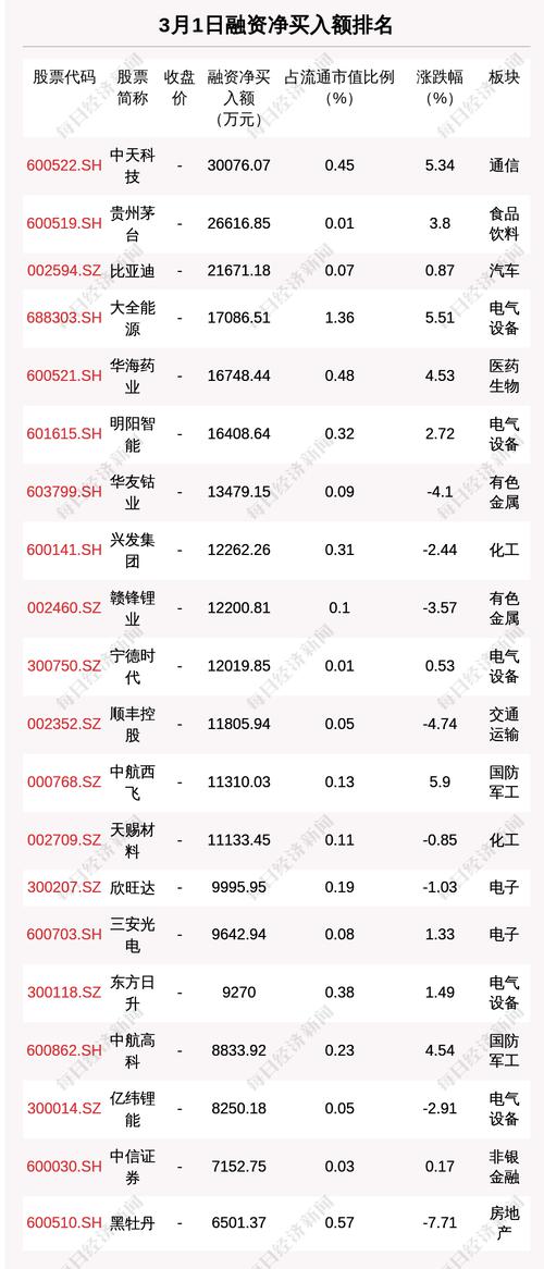 从融资资金净买入金额来看,共有13只个股净买入金额超亿元,其中中天科技、贵州茅台、比亚迪排名前三,买入金额分别为3.01亿元、2.66亿元、2.17亿元。