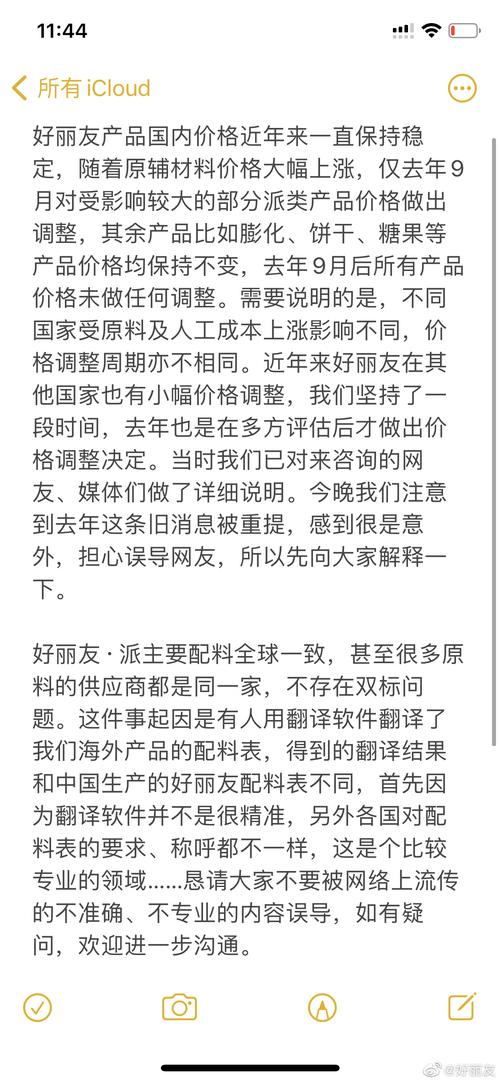 好丽友在官方微博提到,好丽友产品国内价格近年来一直保持稳定,随着原辅材料价格大幅上涨,仅去年9月对受影响较大的部分派类产品价格做出调整,其余产品比如膨化、饼干、糖果等产品价格均保持不变,去年9月后所有产品价格未做任何调整。需要说明的是,不同国家受原料及人工成本上涨影响不同,价格调整周期亦不相同。近年来好丽友在其他国家也有小幅价格调整,公司坚持了一段时间,去年也是在多方评估后才做出价格调整决定。