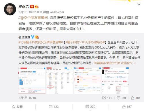 对此,2日晚间,交个朋友科技官方微博“交个朋友直播间”发布回应称,这是锤子科技经营手机业务期间产生的案件,该执行案件结案后,法院解除了股权冻结措施,“目前罗老师还在努力工作并按计划替公司偿还剩余债务,还需一点时间”。罗永浩同时也对此回应进行了转发。