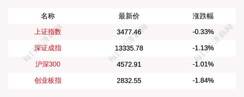 截至北京时间13:30,上证指数报3477.46点,跌0.33%,深证成指报13335.78点,跌1.13%,沪深300报4572.91点,跌1.01%,创业板指报2832.55点,跌1.84%