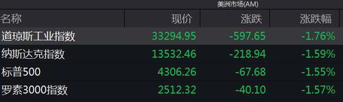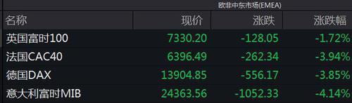 欧股方面,英国富时100指数跌1.72%,法国CAC40指数跌3.94%,德国DAX指数跌3.85%,意大利富时MIB指数跌4.14%。