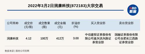 每经讯,2022年3月2日,新三板基础层公司润康科技(872183)发生一笔大宗交易,成交价4.12元/股,成交数量100万股,成交金额412万元,溢价3%。买入营业部是中信建投证券股份有限公司嘉兴洪兴路证券营业部,卖出营业部是国融证券股份有限公司合肥长江西路证券营业部。