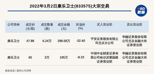 每经讯,2022年3月2日,新三板创新层公司康乐卫士(833575)发生2笔大宗交易,折价率最高的一笔成交价47.88元/股,成交数量6.24万股,成交金额298.58万元,折价32.4%。买入营业部是平安证券股份有限公司北京分公司,卖出营业部是华融证券股份有限公司北京金融大街证券营业部。