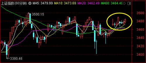 上证指数从小时线上看,连续有8根K线横在一起,出现这样的走势,未来两天小变盘的概率非常高,结合市场缩量的情况,如果是向上放不出力度,切忌不要在拉升的时候追涨,一不小心短期挂在上面就不好了。