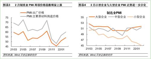 第四,制造业PMI中,两个价格指数分项涨幅较大,保供稳价仍需进一步加码。2月制造业PMI出厂价格分项指数上升3.2个百分点至54.1%,主要原材料购进价格分项上升3.6个百分点至60.%,均表现出连续两个月的明显上升。