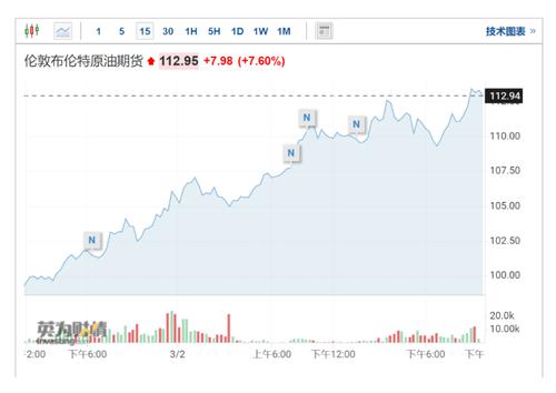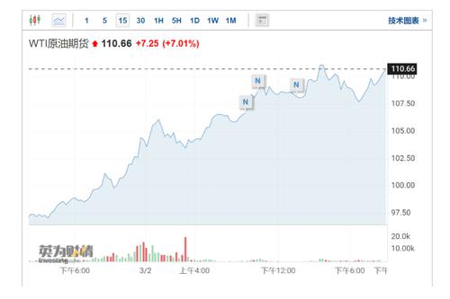 今日晚间,布伦特原油继续拉升,一度破113美元/桶,续创2014年以来最高。WTI原油涨幅7.01%,报110.66美元/桶。