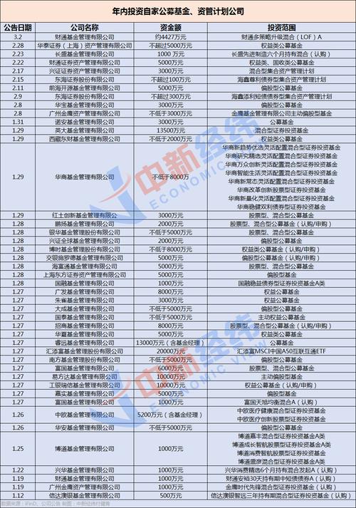 2月15日,东海证券公告将以自有资金申购公司旗下东海证券海鑫尊利债券型集合资产管理计划,参与金额为不超过100万元;2月17日,兴证资管公告近期已运用固有资金投资于公司旗下混合型集合资产管理计划总计3000万元;2月22日,财通资管公告于21日出资5000万元自有资金申购公司旗下权益类、固收类公募基金;2月28日,华泰资管公告称将运用不超过5000万元自有资金投资公司旗下权益类公募基金。
