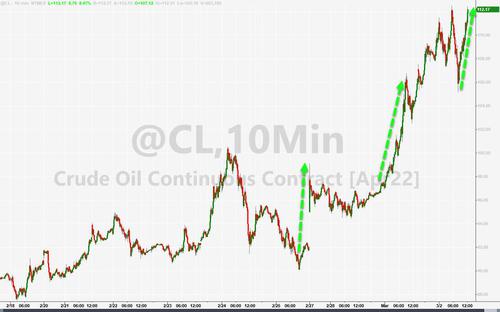 国际原油期货连涨三日。美国WTI 4月原油期货收涨6.95%,报110.60美元/桶,创2011年5月以来收盘新高;布伦特5月原油期货收涨7.58%,报112.93美元/桶,创2014年6月以来收盘新高。