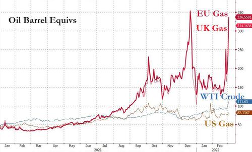 欧洲天然气连涨三日,且进一步加速上涨,逼近或突破历史高位。周三ICE英国天然气期货收涨35.89%,报394.05便士/千卡,创去年12月22日以来收盘新高,欧市早盘一度涨至463.83便士,逼近去年12月21日所创盘中历史高位470.83便士。TTF基准荷兰天然气期货欧市尾盘涨38.10%,自今年1月4日以来首次一日涨超30%,报174.00欧元/兆瓦时,创去年12月21日以来新高,一度涨至194欧元,刷新去年12月21日所创的盘中历史高位184.950欧元,较周二收盘涨约60%。