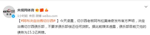 3日凌晨,英超切尔西俱乐部发表官方声明,宣布老板阿布拉莫维奇正式出售球队。据央视网体育微博消息,此前媒体透露,俱乐部目前欠他的债务为15.1亿英镑。