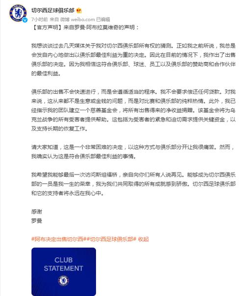 我想谈谈过去几天媒体关于我对切尔西俱乐部所有权的猜测。正如我之前所说,我总是会发自内心地做出以俱乐部最佳利益为重的决定。因此在目前的情况下,我作出了出售俱乐部的决定。因为我相信这符合俱乐部、球迷、员工以及俱乐部的赞助商和合作伙伴的最佳利益。