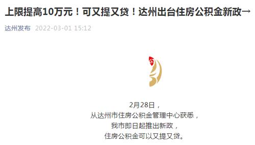 “达州发布”微信号近日消息,从2月28日起,四川省达州市的住房公积金将实行新政,住房公积金可以“又提又贷”。