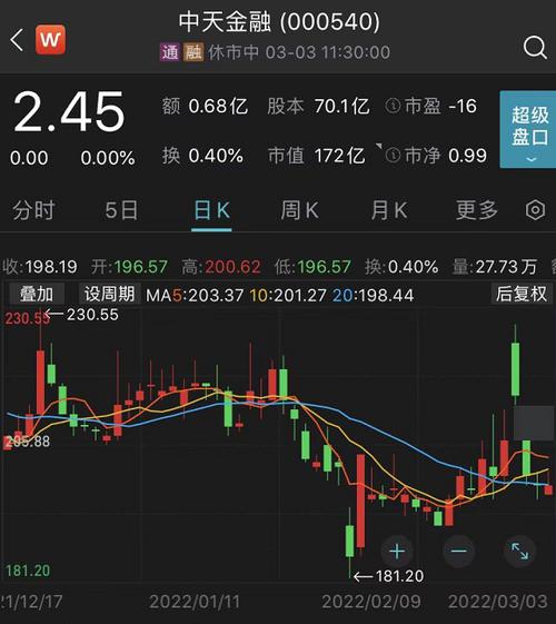 二级市场上,今天(3月3日)中天金融低开后小幅震荡,截至午间休盘,每股报2.45元,股价平收,总市值171.6亿元。而自2015年7月以来,中天金融股价一直处于下降通道,从最高点的11.62元(前复权)到目前的2.45元,跌幅达近80%。