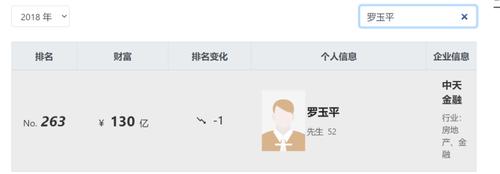 中天金融实控人罗玉平曾是2018年胡润百富榜贵州首富,当时罗玉平身家130亿,在榜单中排名263位。