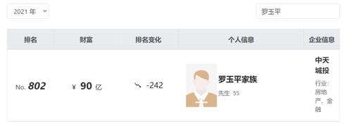 而到了2021年的榜单,罗玉平家族的财富已经缩水到90亿。罗玉平财富缩水背后,中天金融近年来举步维艰。