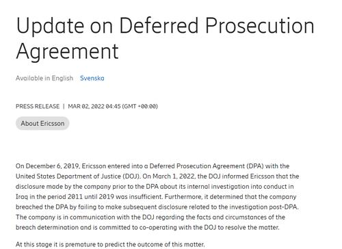 根据爱立信当地时间周三(3月2日)披露的公告,美国司法部在3月1日通知公司,他们在签署DPA前有关伊拉克问题内部调查的披露并不充分,同时该部门认定爱立信在完成调查后也未进行情况披露,构成违反DPA的情形。