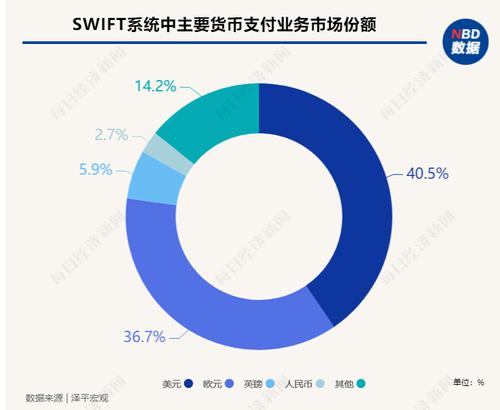 任泽平团队分析指出,截至2021年底,SWIFT系统中,美元、欧元、英镑、人民币的支付业务市场份额占比分别为40.5%、36.7%、5.9%、2.7%,可以看出,美元仍占据主导地位。