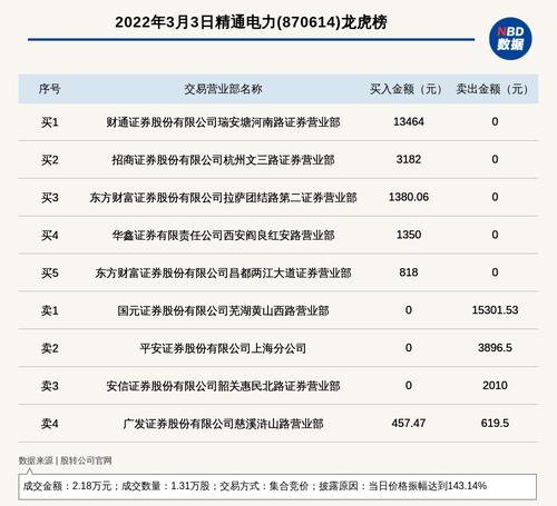 每经讯,2022年3月3日,新三板创新层公司精通电力(870614)登上龙虎榜,交易方式是集合竞价,披露原因是当日价格振幅达到143.14%,成交数量1.31万股,成交金额2.18万元。买一席位为财通证券股份有限公司瑞安塘河南路证券营业部,买入1.35万元;卖一席位为国元证券股份有限公司芜湖黄山西路营业部,卖出1.53万元。