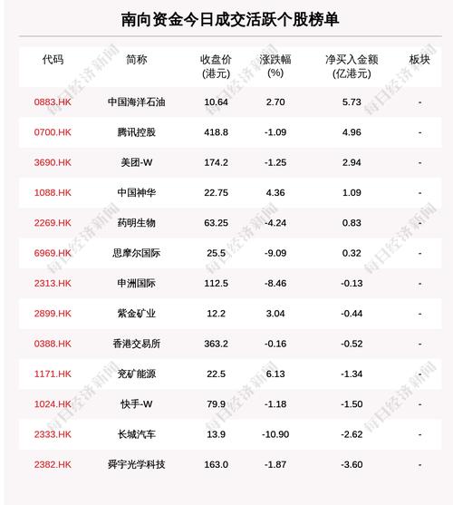 南向资金成交活跃个股榜单中,净买入个股共6只,金额最多的是中国海洋石油(0883.HK,收盘价:10.64港元),净买入5.729亿港元;净卖出个股共7只,金额最多的是舜宇光学科技(2382.HK,收盘价:163.0港元),净卖出3.599亿港元。