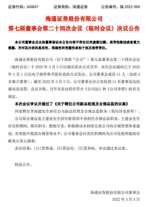 今日盘后,海通证券发布公告称,公司董事会审议并通过了《关于聘任公司副总经理及合规总监的议案》,同意聘任李海超担任公司副总经理及合规总监职务,原合规总监王建业因年龄原因不再担任合规总监职务。王建业此前曾担任海通证券合规总监一职近10年。