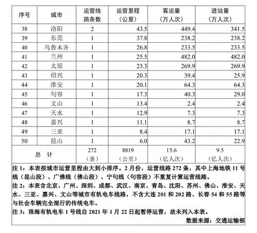 具体来看,2月份,上海、北京、广州三地城市轨道交通客运量分列前三位,分别是24506.5万人次、19024.6万人次、17014.1万人次。