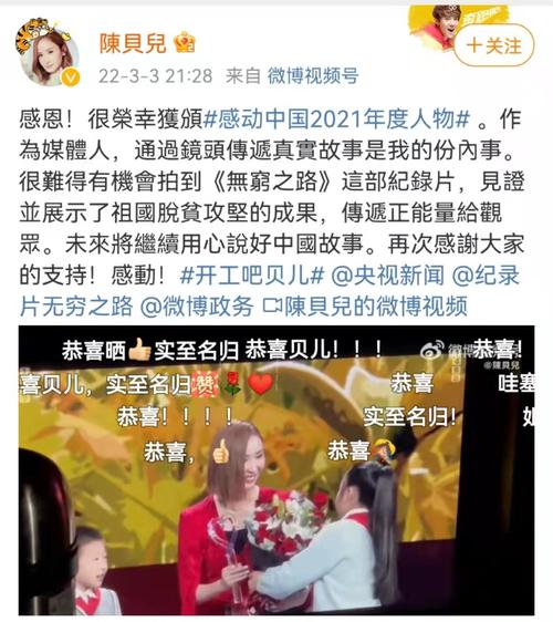 随后,陈贝儿在个人微博上对自己获得感动中国2021年度人物一事进行了回应:
