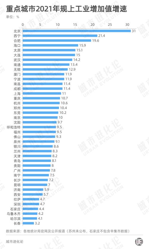 其中,北京、西宁、合肥、海口、太原、大连等城市规上工业增加值增速领先,分别达到31%、21.4%、19.6%、15.9%、15.1%、15%;长春(3.2%)、哈尔滨(4.1%)、乌鲁木齐(4.2%)、石家庄(4.4%)、拉萨(4.7%)、深圳(4.7%)等城市规上工业增加值增速相对较缓。