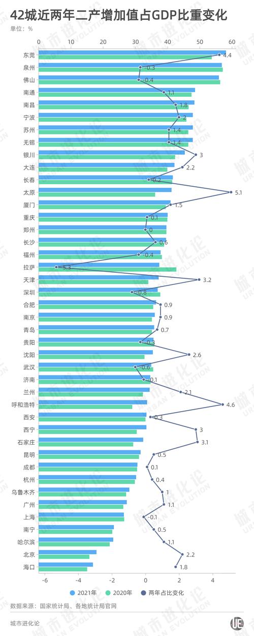 此外,呼和浩特、东莞、天津等城市去年第二产业增加值比重上升幅度较大。其中,去年新晋“万亿俱乐部”的东莞,第二产业增加值比重从2020年53.8%提高到58.2%,比重超过泉州、佛山,居全国首位。