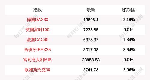 每经AI快讯:北京时间3月4日00:30,德国DAX30指数收盘下跌301.71点,跌幅为2.16%,报收13698.4点;英国富时100指数收盘下跌0.0点,跌幅为0.0%,报收7238.85点;法国CAC40指数收盘下跌119.65点,跌幅为1.84%,报收6378.37点;西班牙IBEX35指数收盘下跌303.02点,跌幅为3.64%,报收8017.98点;富时意大利MIB指数收盘下跌0.0点,跌幅为0.0%,报收23958.83点;欧洲斯托克50指数收盘下跌78.81点,跌幅为2.06%,报收3741.78点。