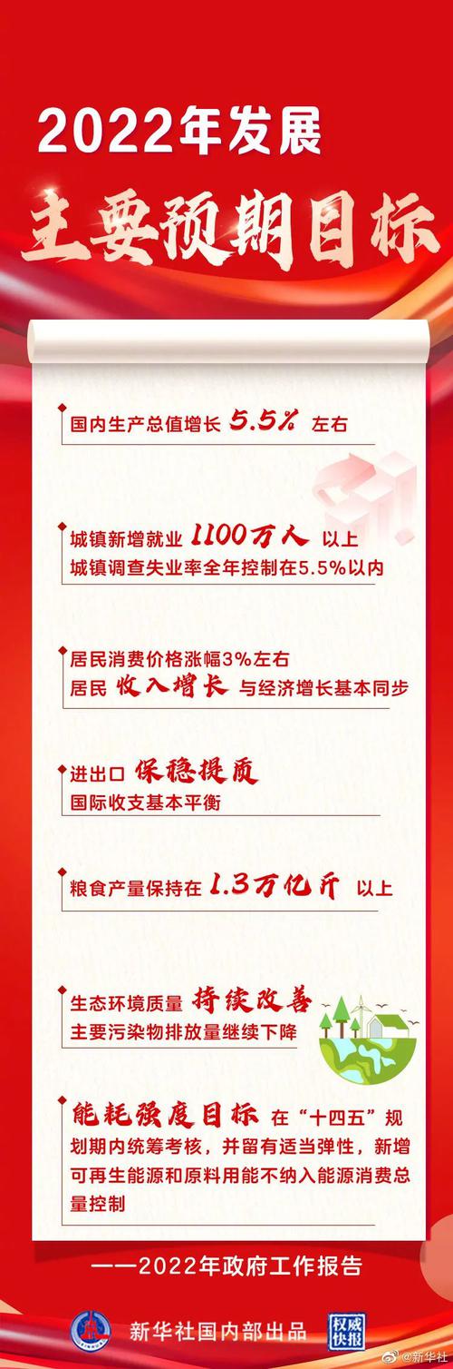 国务院总理李克强5日在政府工作报告中提出,今年发展主要预期目标是:国内生产总值增长5.5%左右;城镇新增就业1100万人以上,城镇调查失业率全年控制在5.5%以内;居民消费价格涨幅3%左右;居民收入增长与经济增长基本同步;进出口保稳提质,国际收支基本平衡;粮食产量保持在1.3万亿斤以上;生态环境质量持续改善,主要污染物排放量继续下降;能耗强度目标在“十四五”规划期内统筹考核,并留有适当弹性,新增可再生能源和原料用能不纳入能源消费总量控制。