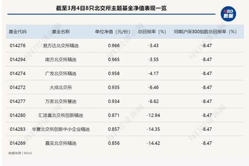 整体来看,截至3月4日,沪深300指数较之前一周下滑了约1.5个百分点至-8.47%。与之前一周的情况一样,8只北交所主题基金中仍然有3只单位净值保持在“8字头”,同样也跑输同期沪深300指数。其中,嘉实北交所精选的总回报率已经落后同期沪深300指数总回报率近6个百分点。
