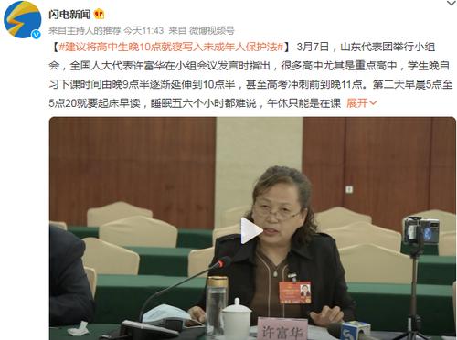 据闪电新闻,3月7日,山东代表团举行小组会,全国人大代表许富华在小组会议发言时指出,很多高中尤其是重点高中,学生晚自习下课时间由晚9点半逐渐延伸到10点半,甚至高考冲刺前到晚11点。第二天早晨5点至5点20就要起床早读,睡眠五六个小时都难说,午休只能是在课桌上趴着睡半个小时,课外活动、体育锻炼更是奢侈品。
