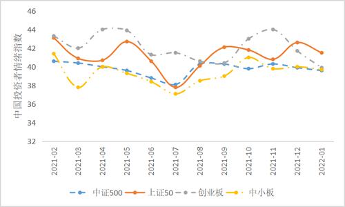 2022年1月,创业板投资者情绪指数为39.9,较上月小幅下降了4.3%;中小板投资者情绪指数为39.7,较上月小幅下降了0.8%;上证50投资者情绪指数为41.5,较上月小幅下降了2.6%;中证500投资者情绪指数为39.6,较上月小幅下降了0.8%(图5)。