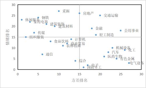 除了投资者情绪的水平值之外,本报告进一步考察情绪的波动情况。图8将2022年1月投资者情绪按照平均情绪水平和方差分为四个象限。其中,左上象限是情绪水平高、波动低,表明投资者持续乐观;右上象限是情绪水平高、波动高,反映一个月内对该行业不同投资者虽然总体看好但不一致程度也较高;左下为情绪低波动低,说明投资者当月对该行业较悲观;而右下象限则是情绪低波动高,说明在悲观的基调下也有乐观的要素。总体看来,投资者对采掘等行业持续乐观,对综合等行业情绪水平相对较低;公用事业、交通运输等行业情绪总体水平高但是波动大;而有色金属、电气设备等行业投资者情绪偏悲观且情绪波动也比较大(图8)。