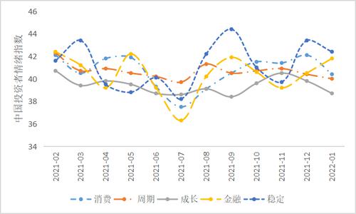 2022年1月总体来看,投资者情绪指数按风格分别是消费(40.4)、周期(40)、成长(38.7)、金融(41.8)、稳定(42.4)。其中金融延续上月涨势,较上月明显上升,消费、周期、成长和稳定风格均悉数小幅下跌。