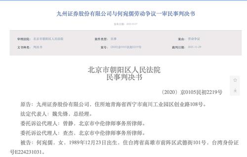 3月7日,北京法院审判信息网披露的《九州证券股份有限公司与何宛儒劳动争议一审民事判决书》显示,诉讼中,九州证券主张何宛儒原为其公司金融资产管理部资深产品经理,在2017年7月、9月期间作为项目主要人员主持发行了九州瀚海集合资产管理计划、九州瀚海明珠集合资产管理计划,因对项目进行的前期调查、中期投后管理、后期风险处置存在失职和过错给九州证券造成了经济损失,故要求何宛儒赔偿损失并返还项目奖金。