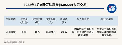 每经讯,2022年3月9日,新三板创新层公司迈达科技(430220)发生一笔大宗交易,成交价8.39元/股,成交数量16万股,成交金额134.24万元,折价29.97%。买入营业部是中国银河证券股份有限公司天津胜利路证券营业部,卖出营业部是华泰证券股份有限公司天津白堤路证券营业部。