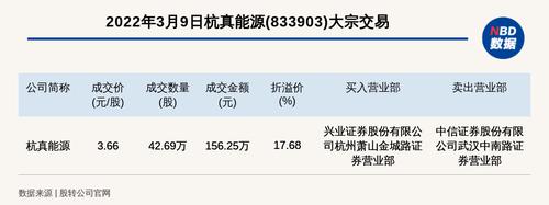 每经讯,2022年3月9日,新三板基础层公司杭真能源(833903)发生一笔大宗交易,成交价3.66元/股,成交数量42.69万股,成交金额156.25万元,溢价17.68%。买入营业部是兴业证券股份有限公司杭州萧山金城路证券营业部,卖出营业部是中信证券股份有限公司武汉中南路证券营业部。
