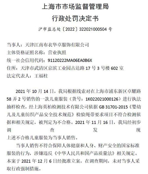 具体来看,行政处罚决定书显示,天津江南布衣华卓服饰有限公司销售的一款货号为1K022021000126的儿童服装经上海英柏检测技术有限公司依据GB 31701-2015《婴幼儿及儿童纺织产品安全技术规范》检测绳带要求项目不符合检测依据和相关规定,被判定为不合格。