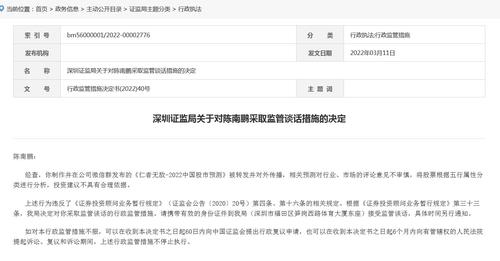 深圳证监局称,经查,陈南鹏制作并在公司微信群发布的《仁者无敌-2022中国股市预测》被转发并对外传播,相关预测对行业、市场的评论意见不审慎,将股票根据五行属性分类进行分析,投资建议不具有合理依据。