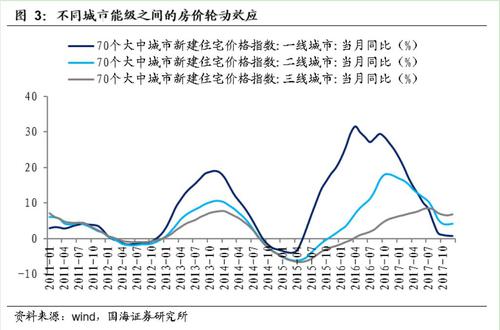 当前,面对分化的市场形势,全国多个城市对房地产政策进行了调整。我们发现,政策的市场反响在不同能级城市间具有轮动效应。一线城市作为资源要素禀赋最优渥、供需相对最紧张、预期收益最大的地方,房价率先领涨。随后,随着流动性外溢,核心二线城市、三线城市依次跟涨。在2012-2016年的两轮房地产市场周期轮动中,均呈现出“一线-二线-三四线”的传导方向。