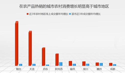 在农产品热销的几大产地,烟台、大连近3年农村地区线上成交额年均增长都超过了10倍,丹东、阿克苏近3年农村地区线上成交额年均增长超过150%。