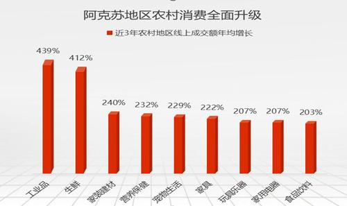近几年,新疆阿克苏苹果畅销全国,成为备受消费者认可的地标农产品。农民们收入提升,在消费层面也能看到生产、生活多方面的消费增长。在商家、厂家所需的生产、包装材料方面,近3年阿克苏地区县域乡村市场的工业品消费线上成交额年均增长439%,说明当地的生产活动十分活跃,并且保持了连年增长的势头。